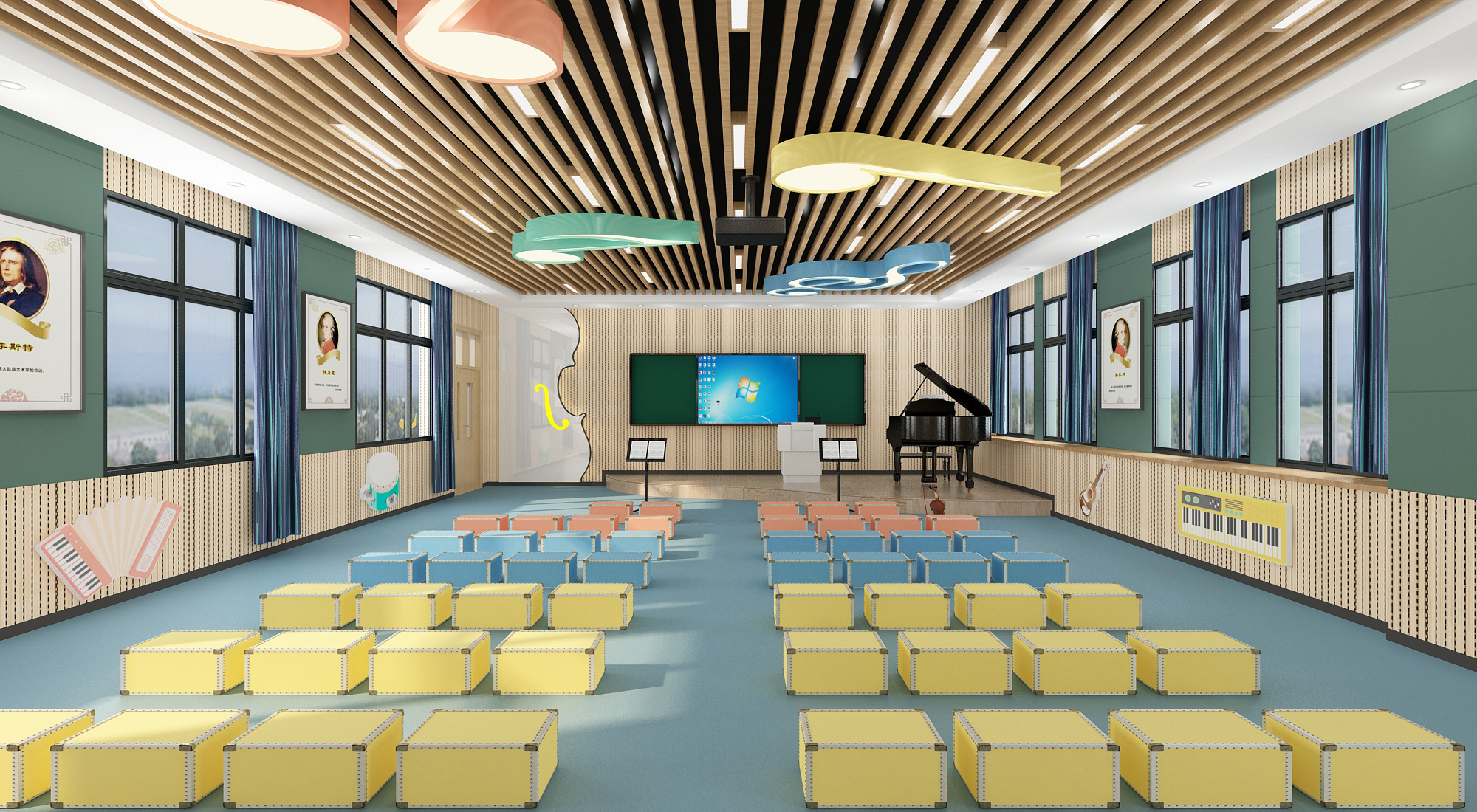 音樂教室是進(jìn)行音樂教育教學(xué),以加強(qiáng)素質(zhì)教育、培養(yǎng)學(xué)生德智體美全面發(fā)展的重要訓(xùn)練基地。我校音樂教室的設(shè)計(jì)清新明亮,作為面向小學(xué)生的音樂教室,不乏自然的親切感。能使同學(xué)們進(jìn)入音樂教室后,如同進(jìn)入音樂殿堂,找到音樂的感覺,在這樣的教室中,愛上音樂很簡單。